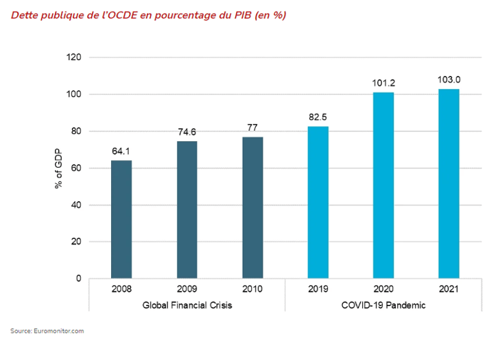 La dette publique des pays de l’OCDE (en gros les pays les plus riches du monde) a explosée depuis 2019, dans de plus grandes mesures que lors de la crise financière de 2008 (+20% en 2 ans contre +25% entre 2019 et 2021), à cause, conjointement, des conséquences de la hausse de l’inflation depuis 2008 mais également de celle liée aux mesures absurdes prises par les gouvernements mondiaux pour lutter contre la grippe chinoise, pourtant peu létale, même pour les personnes avec des comorbidités.