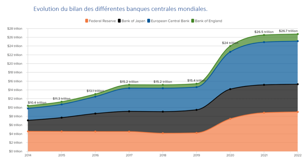 Mais ce n’était que le début, car en janvier 2015, la BCE lance elle aussi un programme massif d’assouplissement quantitatif portant sur le rachat sur le marché secondaire de titres obligataires souverains (dettes d’Etat de la zone euro) et privés. Avec les mêmes méthodes keynésiennes (du nom de l’économiste Keynes) qui n’ont jamais fonctionnées : des injections de monnaie dans le système financier, au rythme de 60 milliards d’euros par mois (pendant initialement 18 mois, évidemment prolongé de multiples fois), pour stimuler l’activité économique. Enfin, en théorie car un des « effets indésirables » de cette politique fut une augmentation artificielle du prix des actions en bourse, totalement décorrélées de l’économie réelle, et ce jusqu’à aujourd’hui où les cours de bourse reprennent des niveaux un peu plus normaux après un krach boursier début 2022.