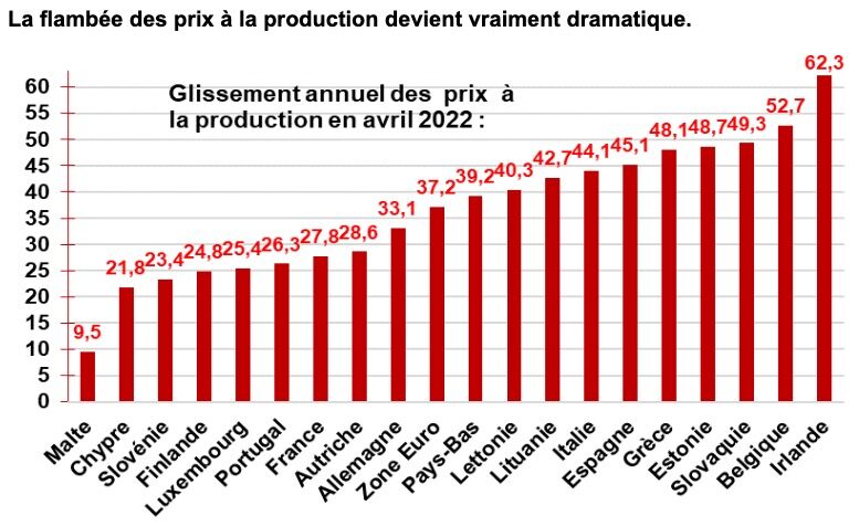 Comme nous le voyons ici, d’Avril 2021 à Avril 2022, l’ensemble des prix à la production ont explosé de 27,8% en France, 39,2% aux Pays-Bas, 44,1% en Italie, 45,1% en Espagne ou encore 52,7% en Belgique et 62,3% en Irlande !