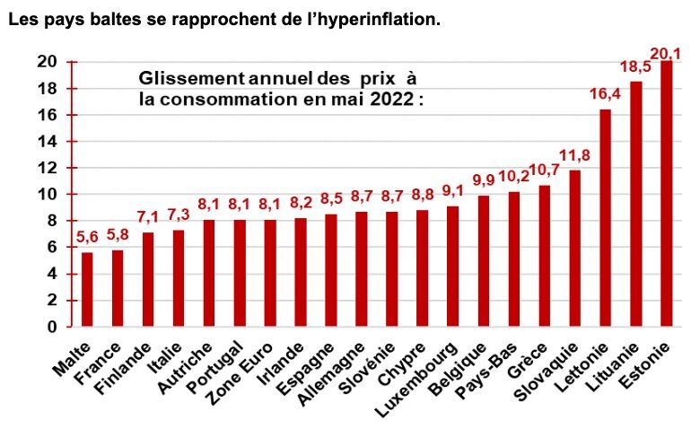 L’inflation dans la zone euro est d’environ 9% (avec de fortes disparités, comme 20,8% en Lituanie, 21% en Lettonie, ou encore 22,7% Estonie !).
