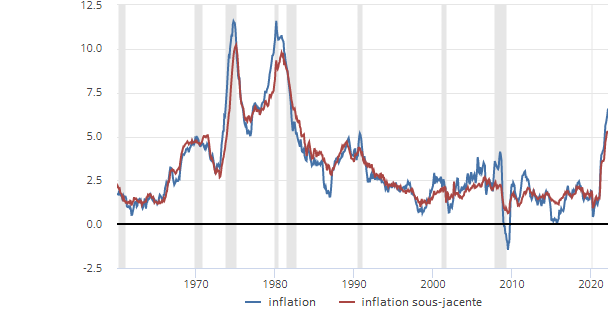 Comme vous le voyez dans ces deux graphiques ci-dessus, il y a une corrélation entre l’inflation et les taux directeurs de la banque centrale américaine (FED). Quand l’inflation augmente (départ à 2,5% en 1972 jusqu’à 11% en 81), les taux commencent à augmenter rapidement (départ à 5% en 72, jusqu’à 15% en 81) pour faire baisser l’inflation efficacement (cela prend cependant des années). L’erreur commise fut de redescendre les taux trop tôt dès 75 quand l’inflation commençait à baisser, ce qui a relancé l’inflation jusqu’à 10% par an en 81. Les taux ont dû être augmenté jusqu’à 23% pour casser l’inflation.