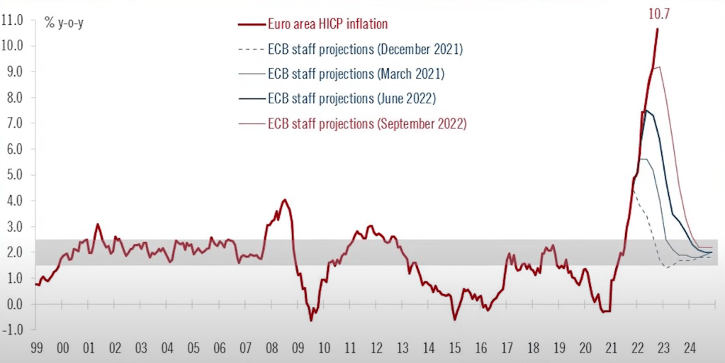 Ce graphique montre également les prévisions d’inflation de la Banque Centrale Européenne (BCE) depuis décembre 2021. Inutile de préciser que les personnes travaillant sur ces prévisions devraient être virées sur le champ pour incompétence.