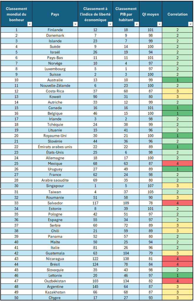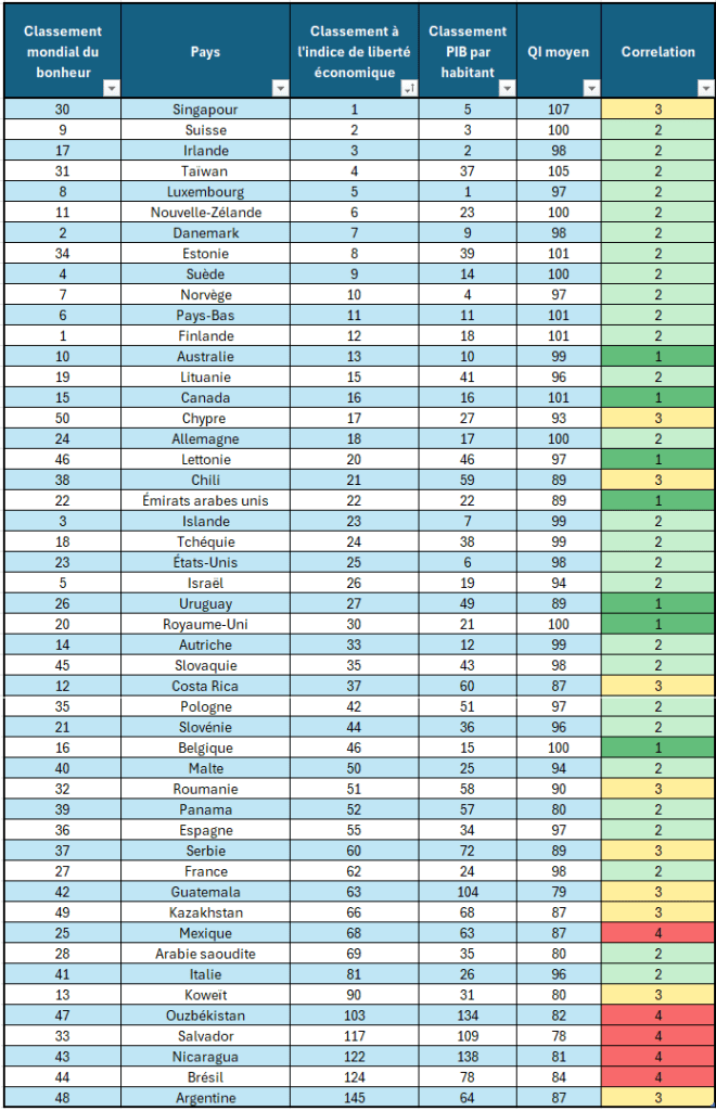La colonne « corrélation » prend en compte la cohérence entre classement du bonheur, celui de l’indice de la liberté économique, et le PIB par habitant (corrélation calculée par l’IA de Microsoft « Copilot » et évidemment vérifiée par mes soins) :